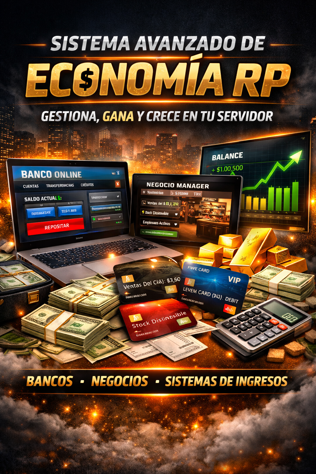 Sistema económico completo para servidores RP. Gestiona ingresos, gastos, negocios y bancos con scripts optimizados y realismo total.