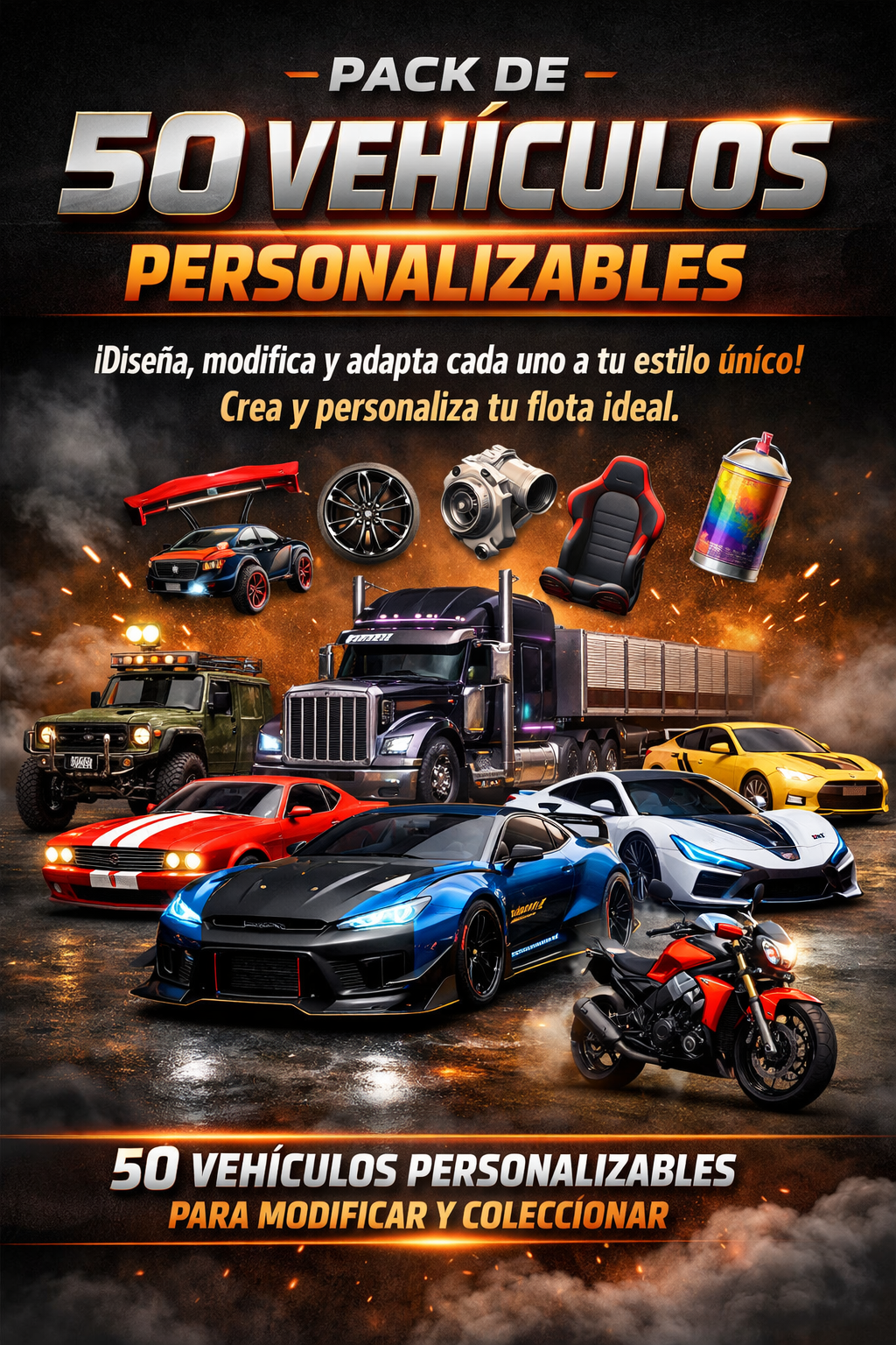 Pack exclusivo con 50 vehículos personalizables. Diseña, modifica y adapta cada uno a tu estilo único para destacar en cualquier escenario.
